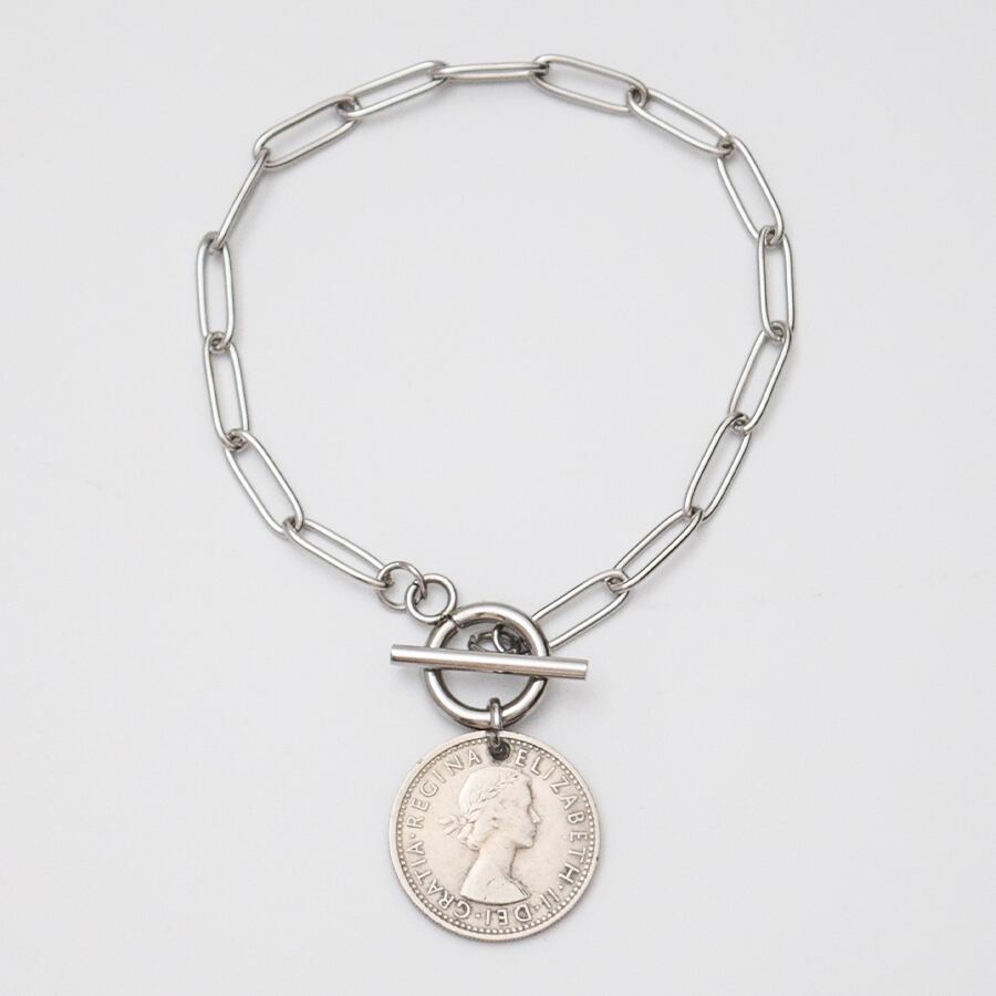 スタイリッシュなペーパーチェーンを使用したブレスレットに、幸せを運ぶシックスペンスコインを組み合わせた特別な一本。
