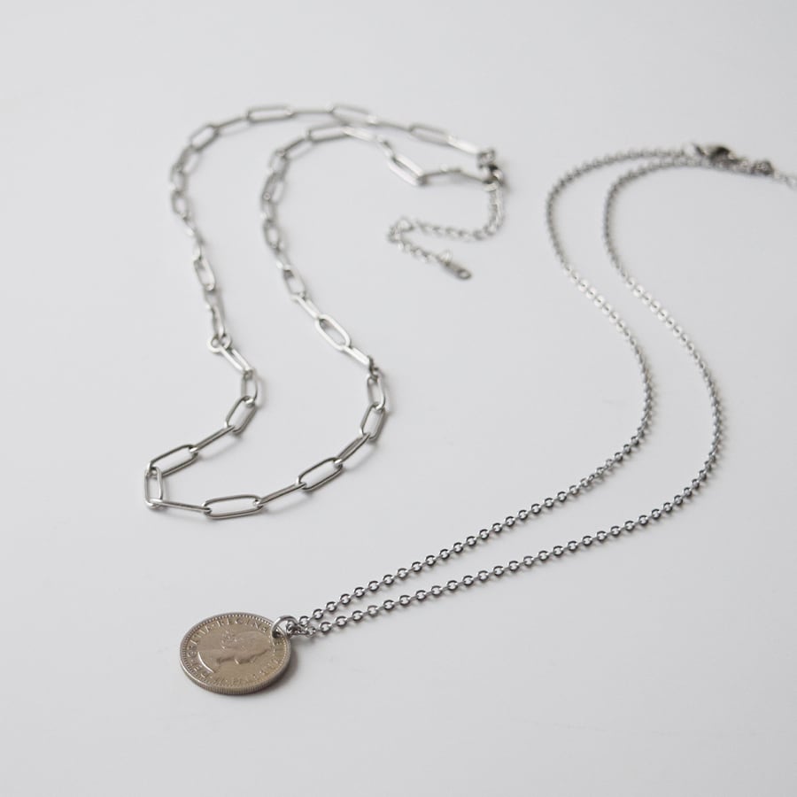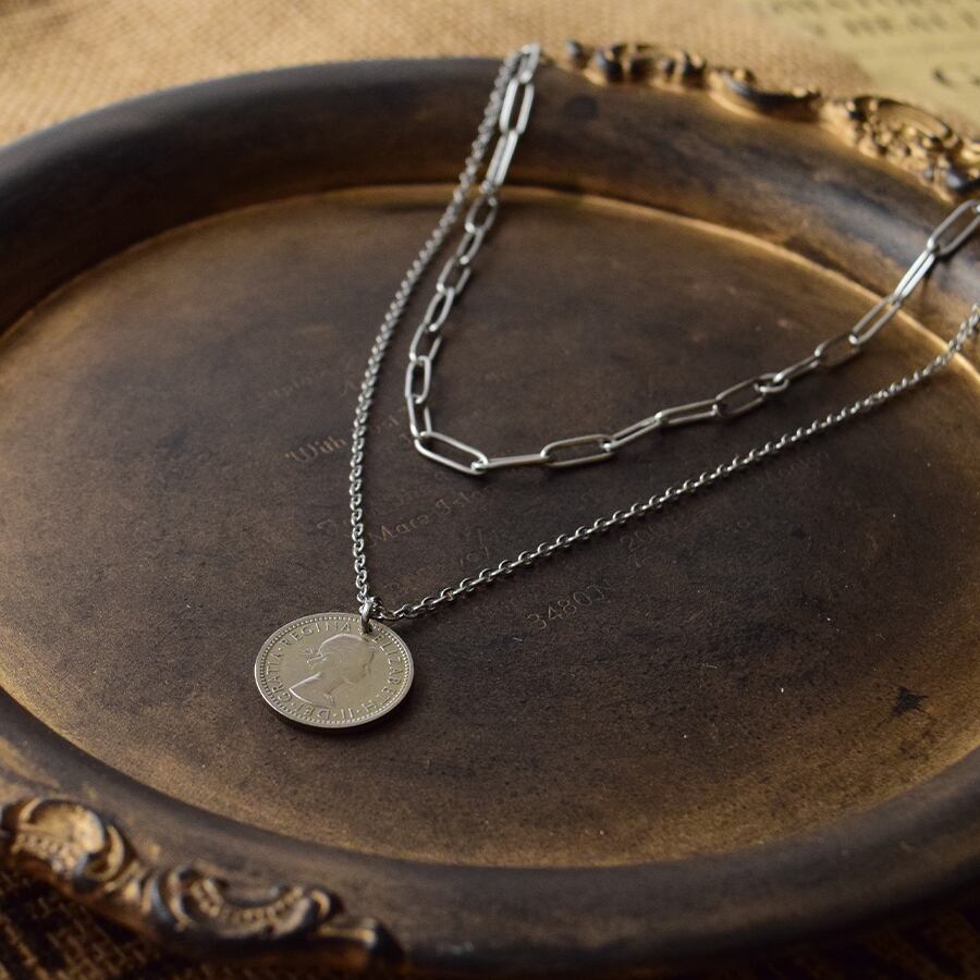 幸せを運ぶシックスペンスコインネックレスと、シンプルで上品なペーパークリップチェーンがセットになったダブルネックレス。