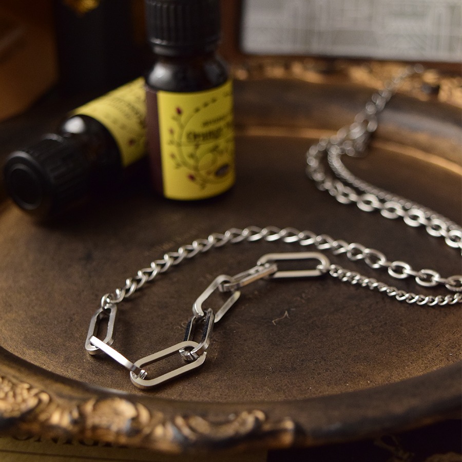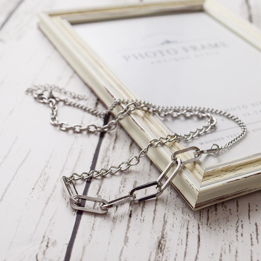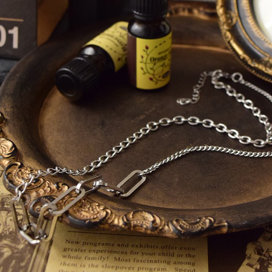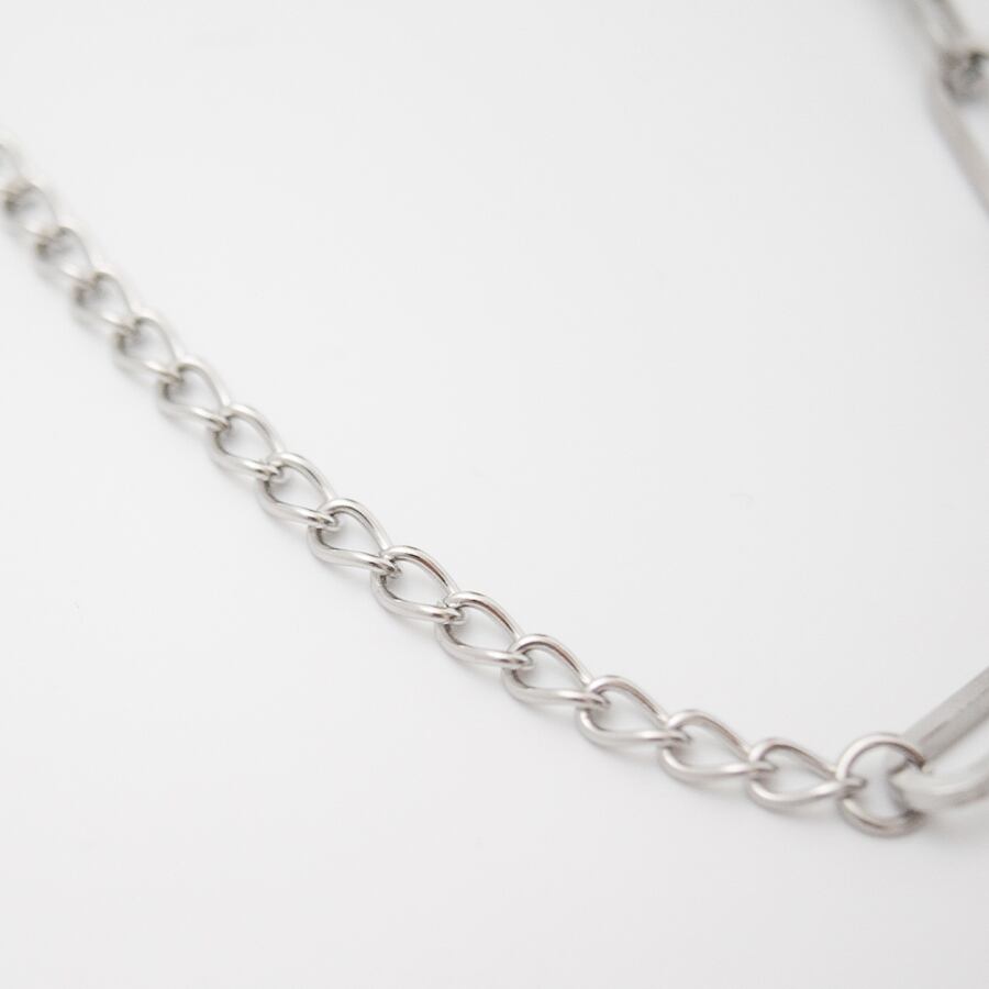 ペーパークリップチェーン、ツイストチェーン、アズキチェーン、キヘイチェーンの4種のチェーンを組み合わせたネックレス。