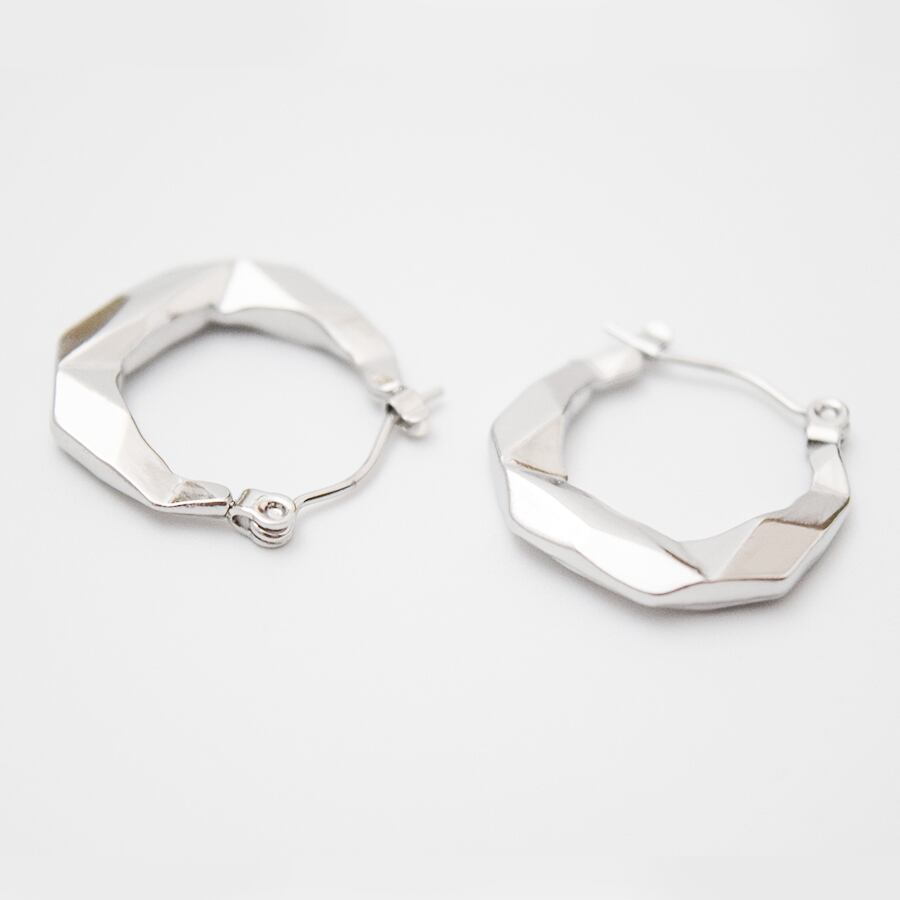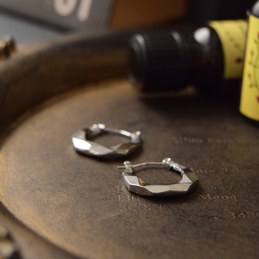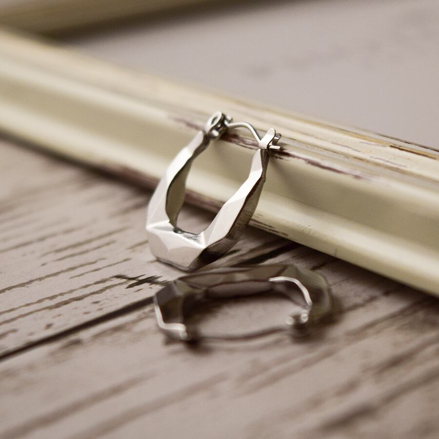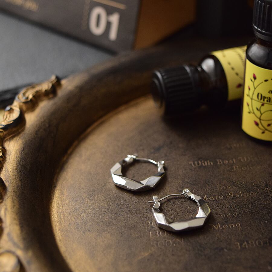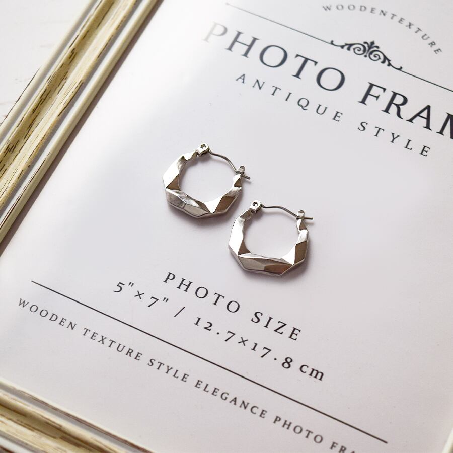 ロックカット加工が施されたカット面がキラッと光るフープピアス。シルバーの輝きが直線的な光を反射し、シャープで洗練された印象を与える。シンプルながら存在感があり、レディースファッションの幅広いスタイルに対応します。韓国トレンドのカジュアルから、オフィスやフォーマルまで幅広いファッションにマッチします。素材はステンレスで、錆びにくく変色しにくい特性を持ち、金属アレルギー対応で、敏感肌にも安心です。軽量で長時間の着用でも快適です。耳元をクールに際立たせるフープピアスなので日常使いはもちろん、プレゼントにも最適な万能アクセサリーです。