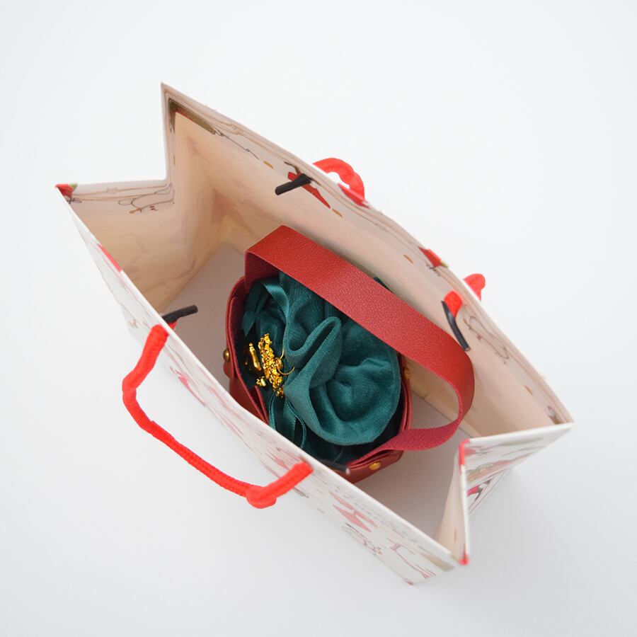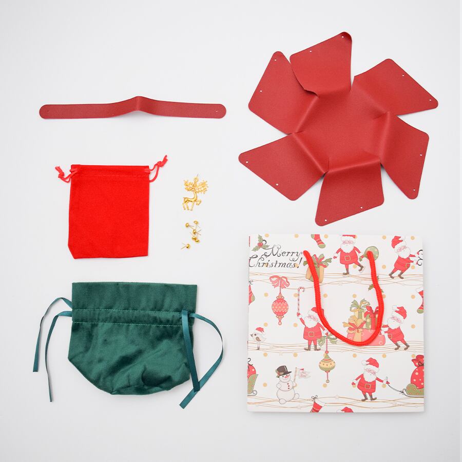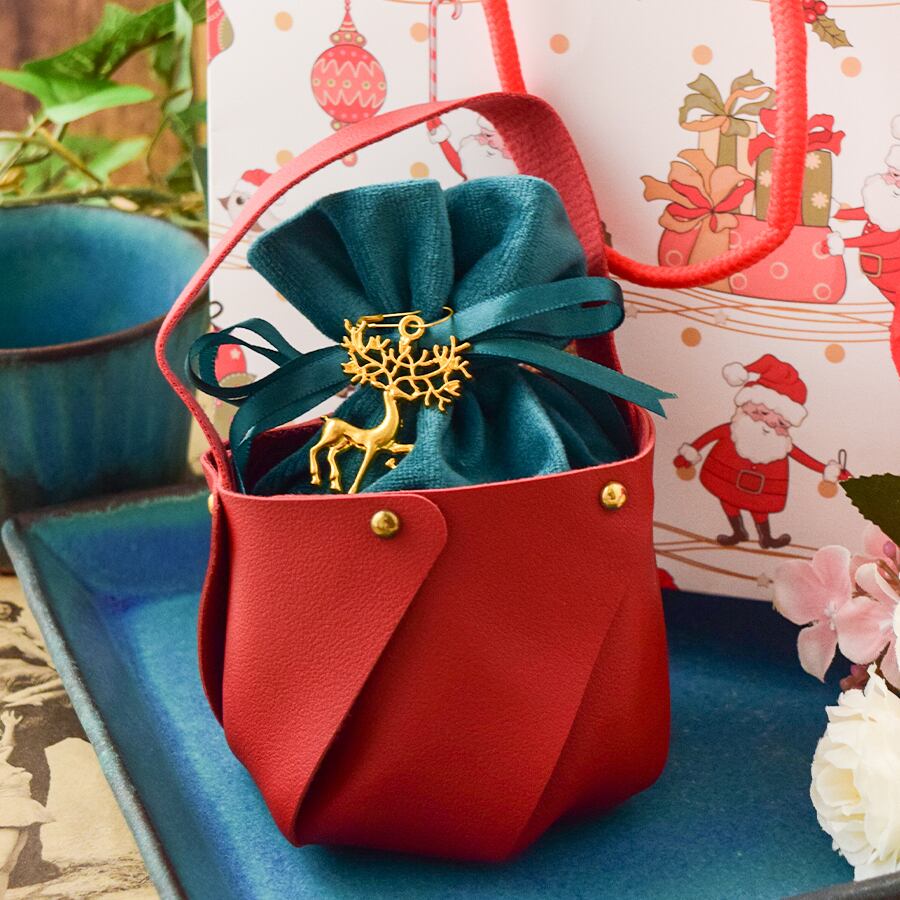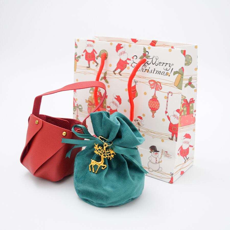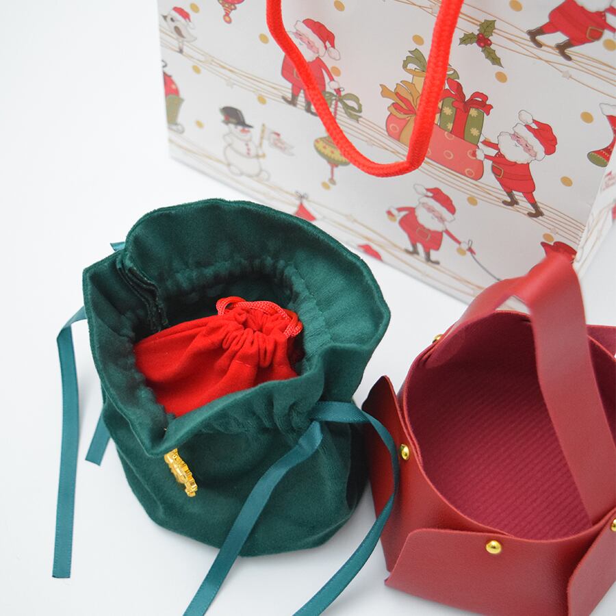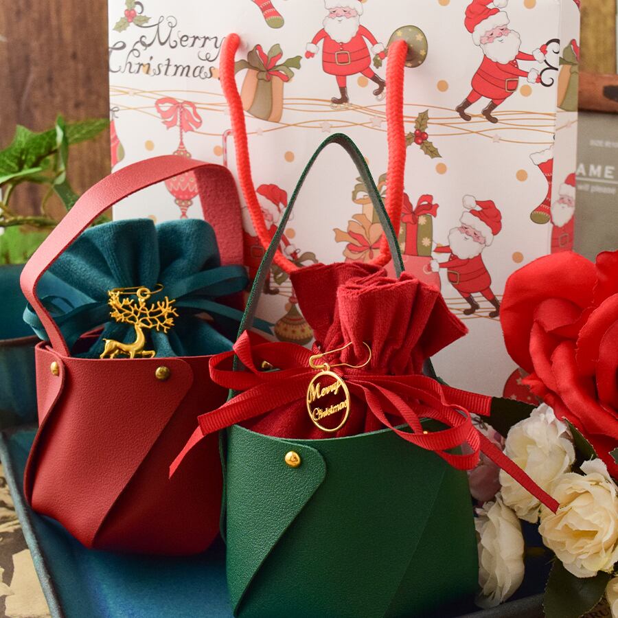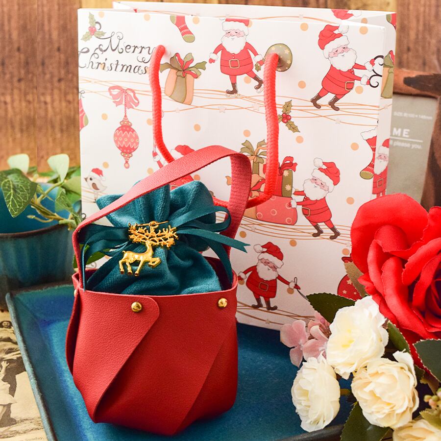 クリスマスの印象を演出するラッピングセットです。クリスマス感漂う、高級感あふれる革調の小さなトートバッグデザインがオシャレ。トートバッグには巾着袋がすっぽり入り、クリスマスを感じさせるゴールドチャームが高級感をUPさせてくれます。さらに、サンタクロース柄のマットな質感のショッパー(紙手提げ袋)を組み合わせました。年末のクリスマスの雰囲気を盛り上げ、大切な贈り物をより一層引き立てます。トータルでのコスパの良さと完成度を追求し、手渡す瞬間までも美しく演出します。