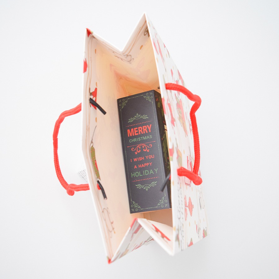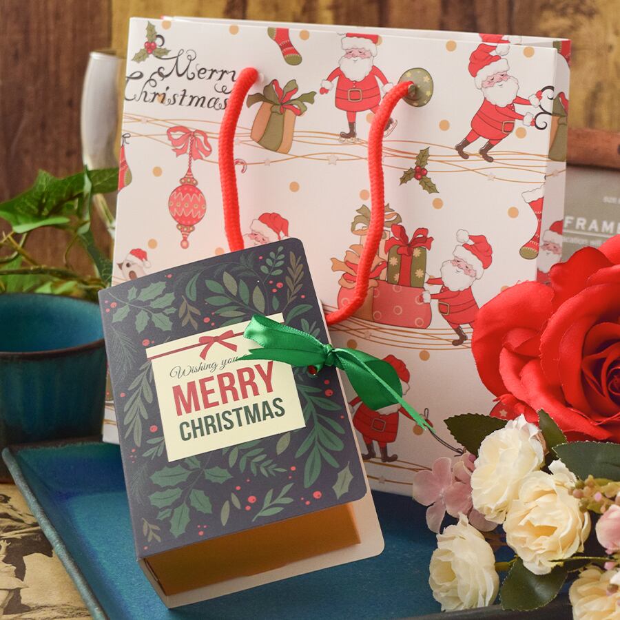 クリスマスの印象を演出するラッピングセットです。クリスマス感漂う柄のギフトボックスと、サンタクロース柄のマットな質感のショッパー(紙手提げ袋)を組み合わせました。赤、白、緑の3色が年末のクリスマスの雰囲気を盛り上げ、大切な贈り物をより一層引き立てます。トータルでのコスパと完成度を追求し、手渡す瞬間までも美しく演出します。
