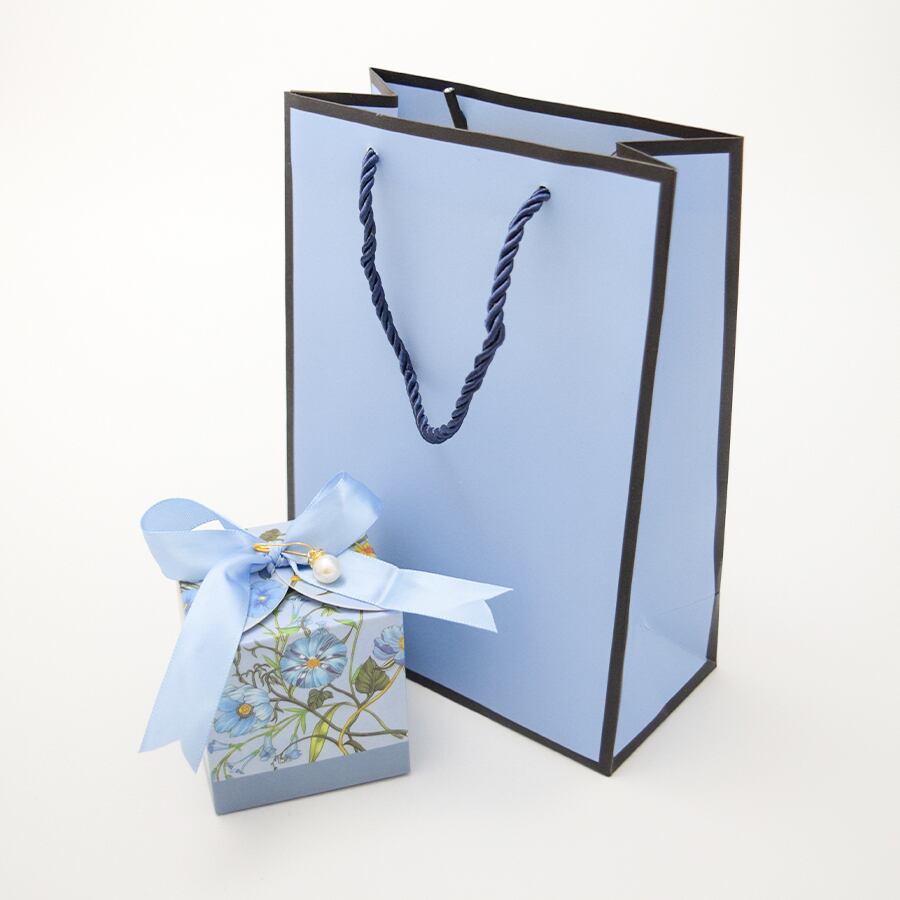 付属のショッパー(紙手提げ袋)は、ボックスとトーンを合わせたマットな質感のスカイブルーで統一。トータルでの完成度を追求し、手渡す瞬間までも美しく演出します。