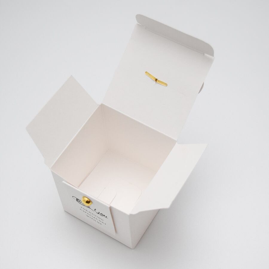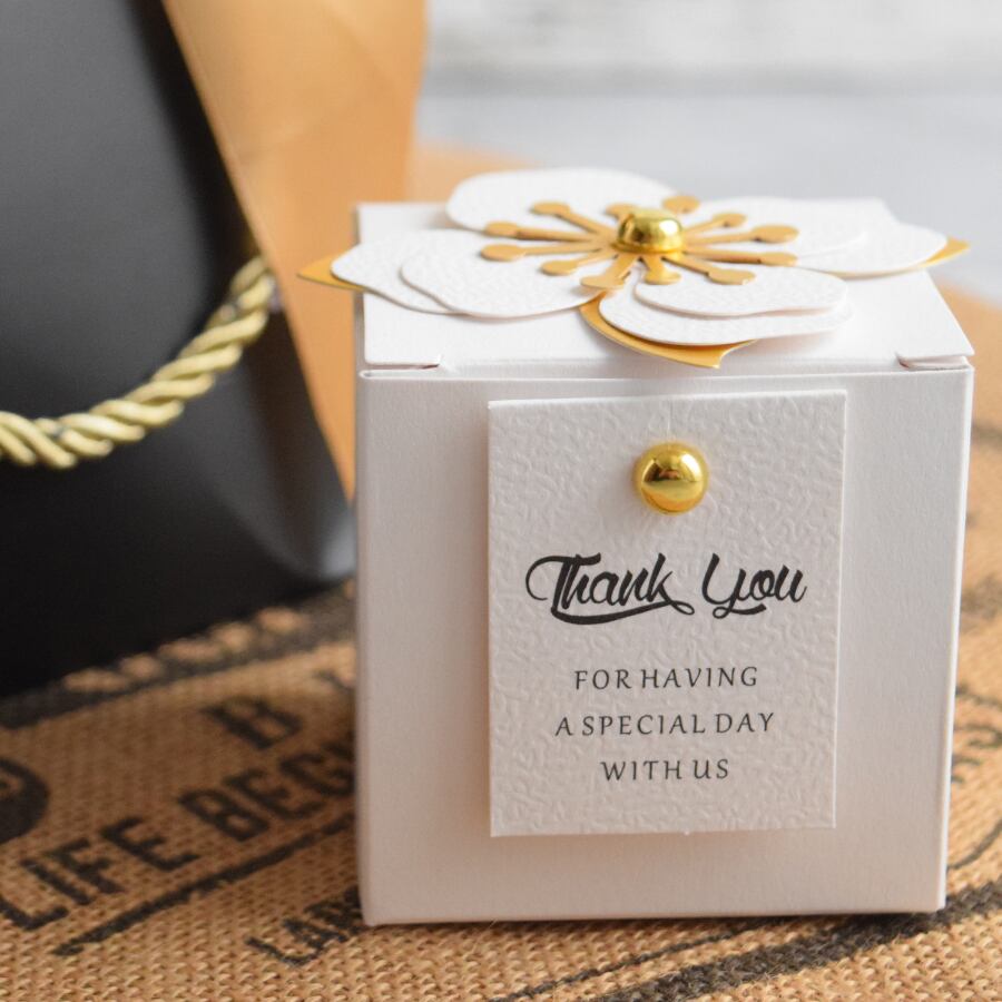 基調となるのは、主張しすぎない落ち着いた白のトーンのギフトボックス。カラーリングは派手さのないカラーでも上部に大きめの花デザインの飾りつけがあるので、単純さを感じさせないデザインになっています。(※花の飾りつけは花びら部分を「少しだけ」立ち上げると、花の飾りつけ全体がよりいっそう立体的な印象になります。)