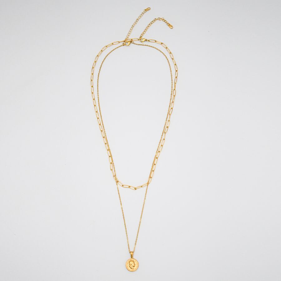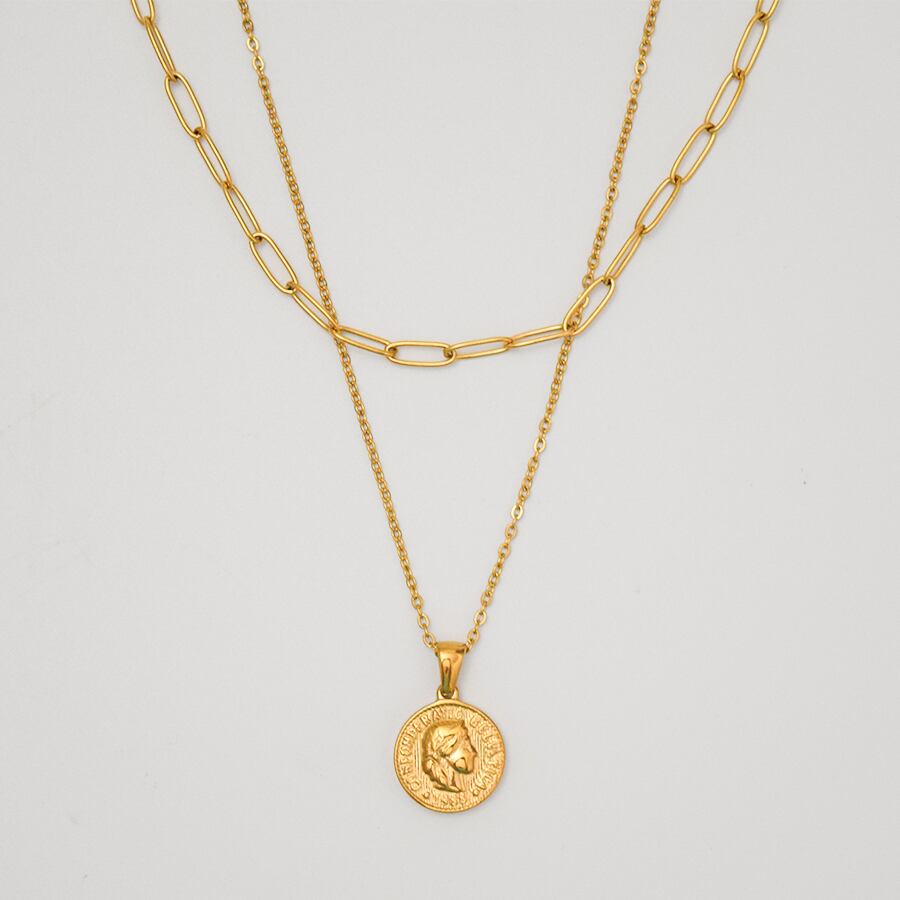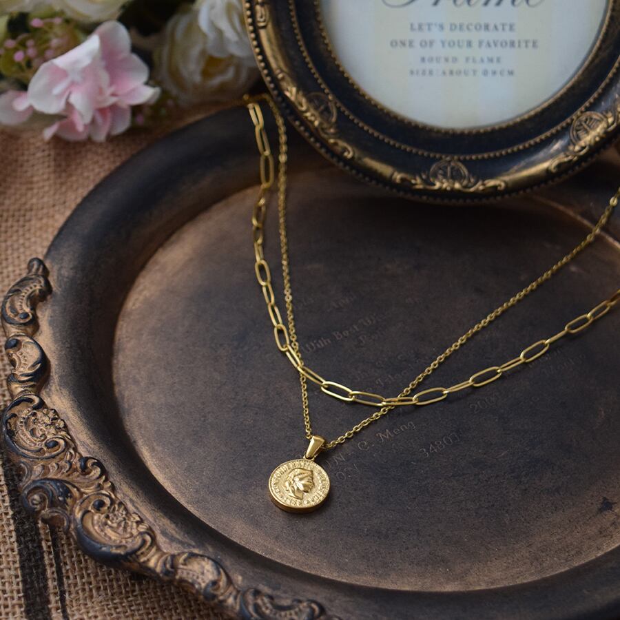 コインのモチーフのネックレスとオーバルチェーンの2点セットのネックレス。重ね着けはもちろん、それぞれのネックレスを単品でも使える便利な3WAY仕様!