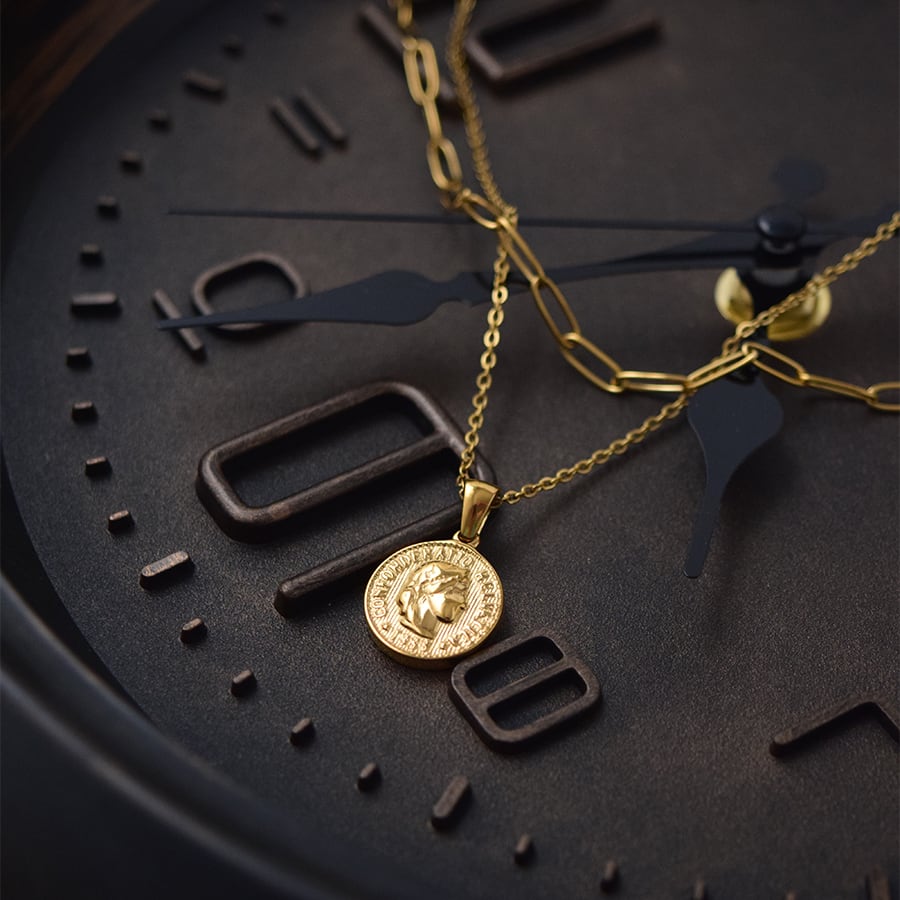 単純なコインネックレスだけではなく、オーバルチェーンを重ね付けることで、首元に程よいボリューム感が生まれ、無地のファッションもシックに決まります。