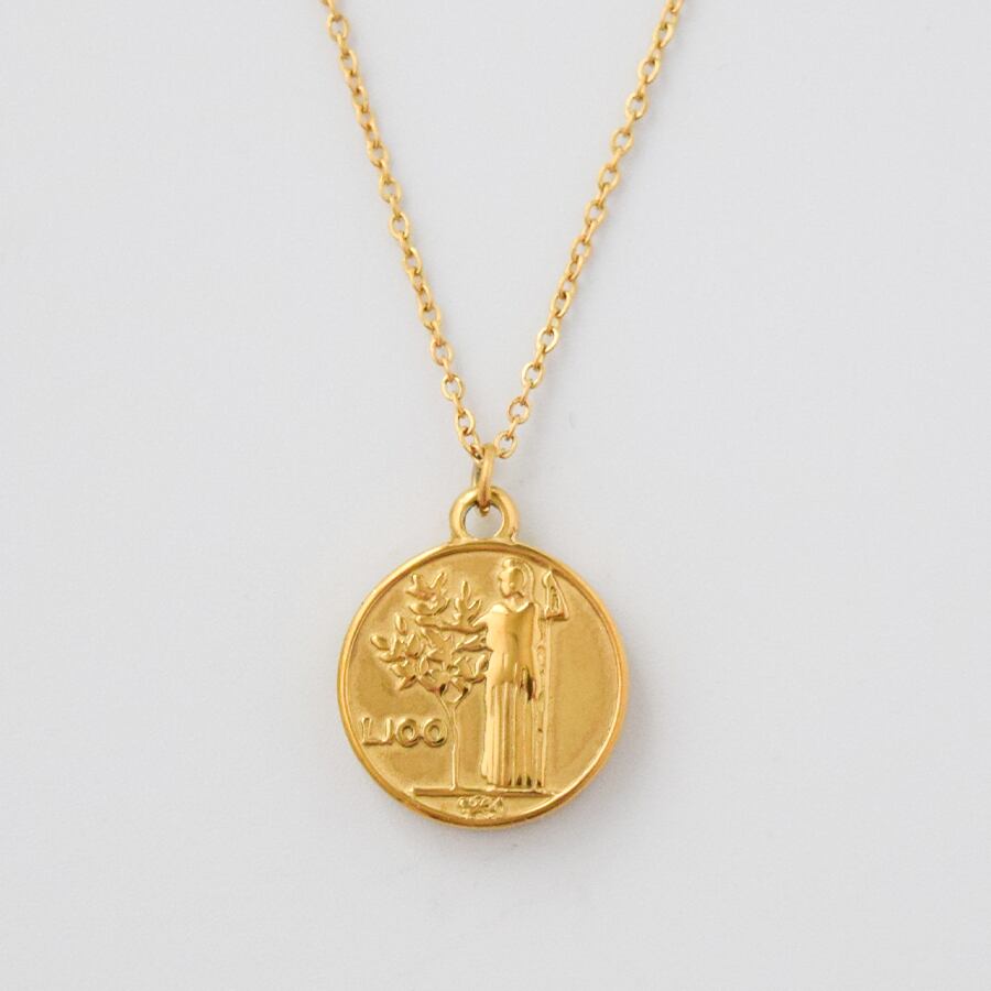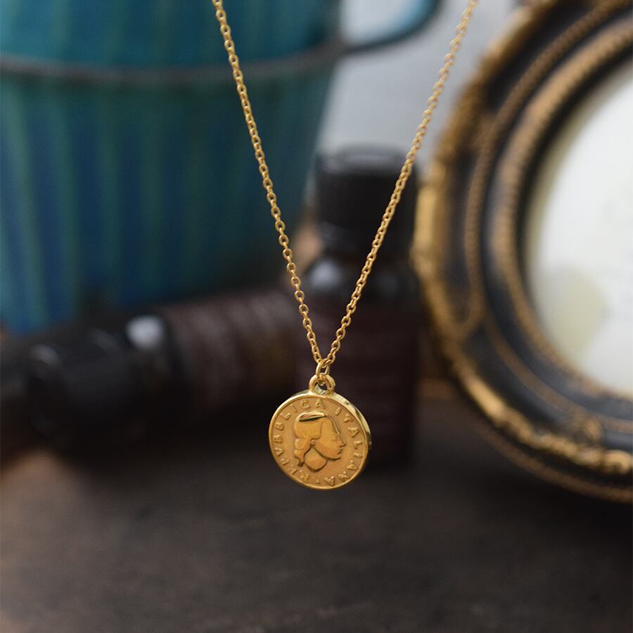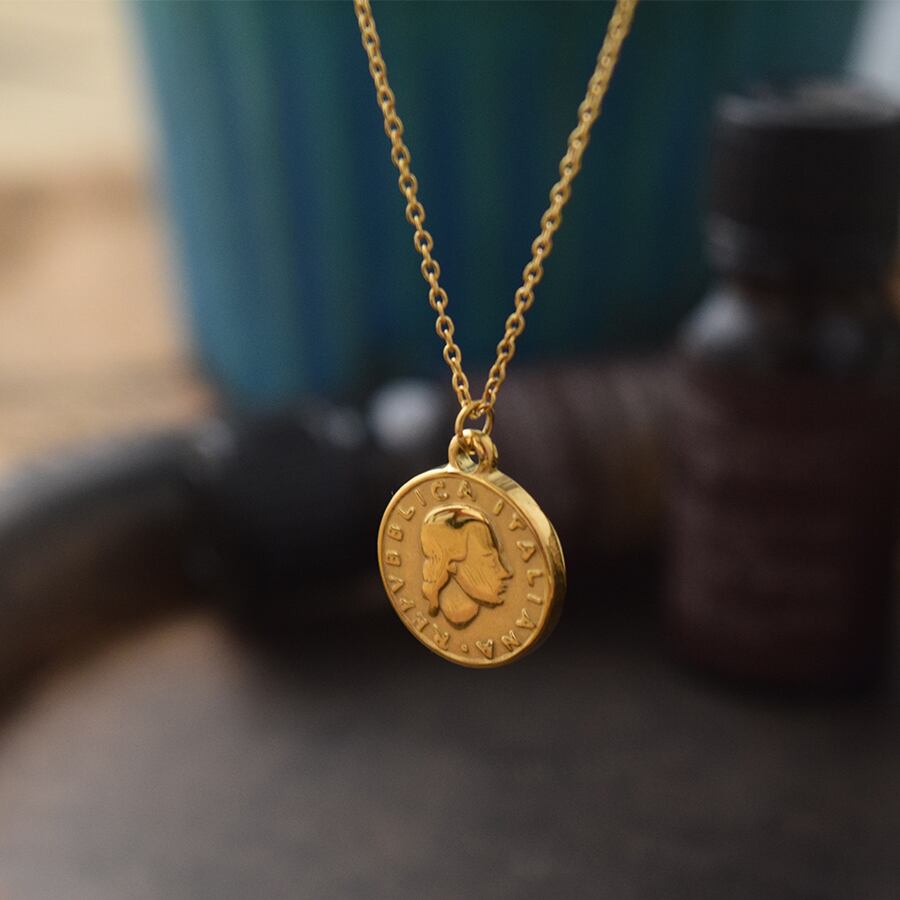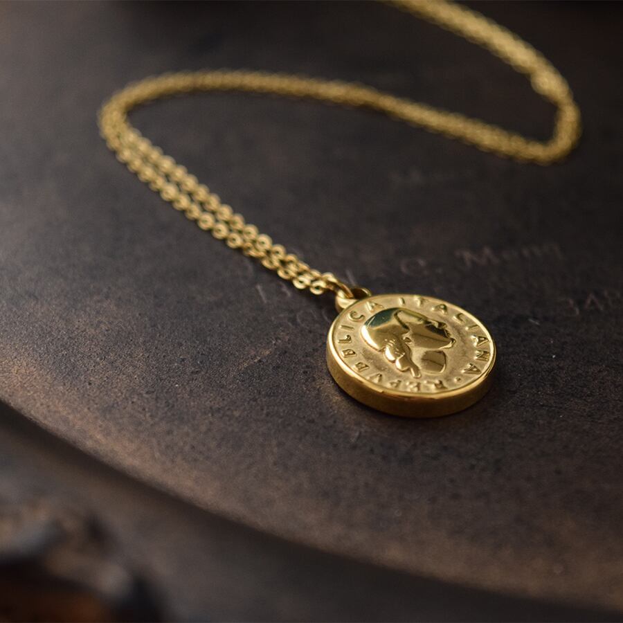イタリアの100リラコインをモチーフにしたステンレス製のネックレス。