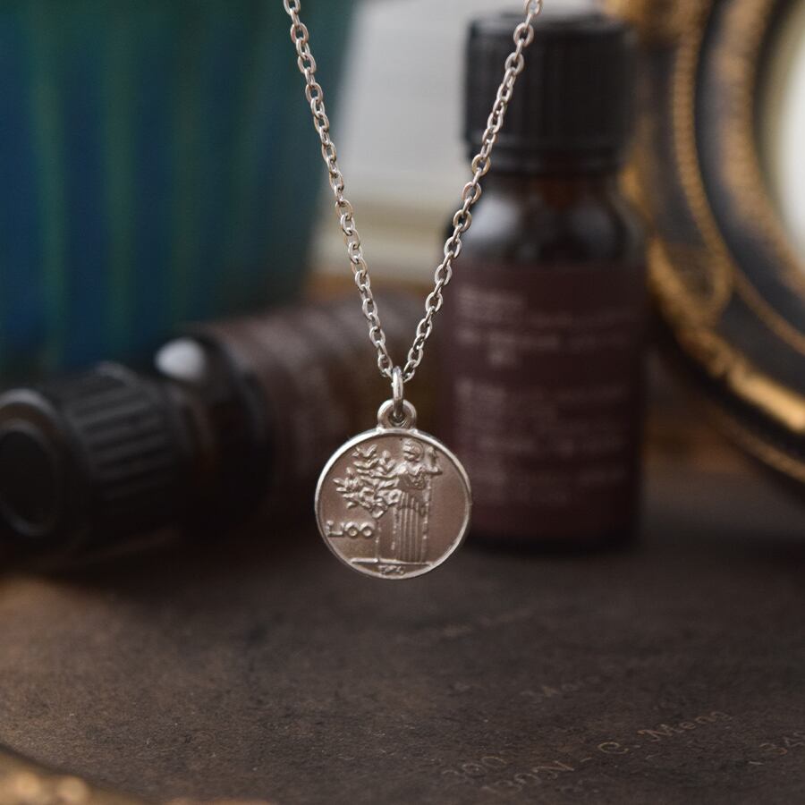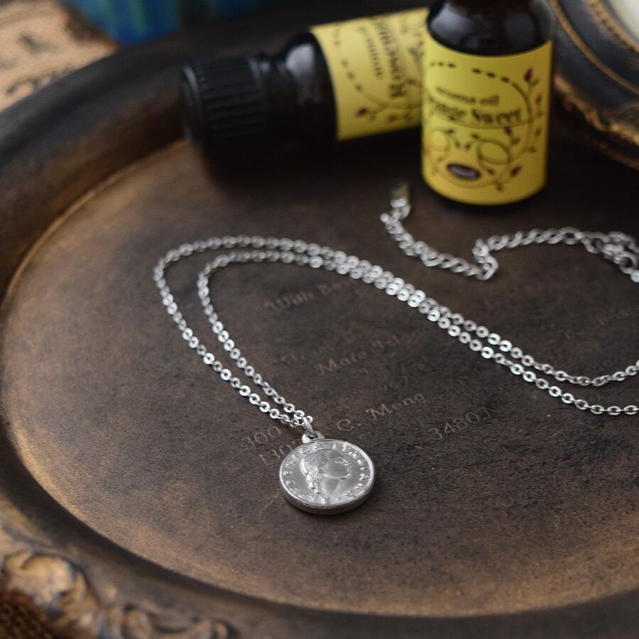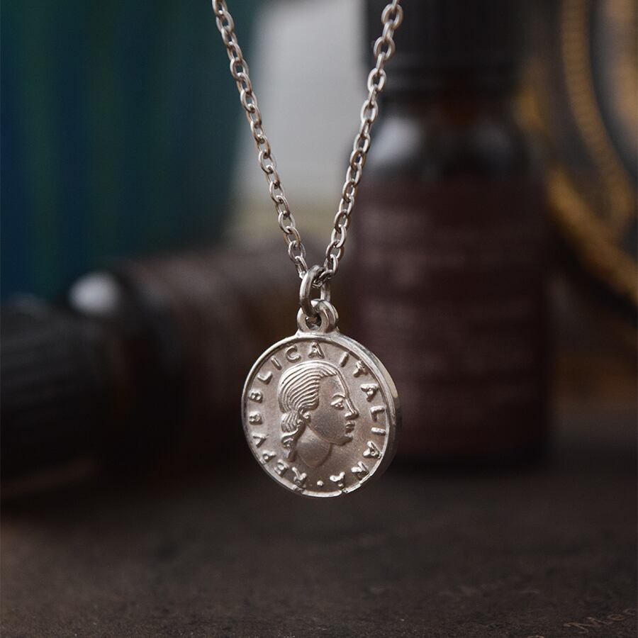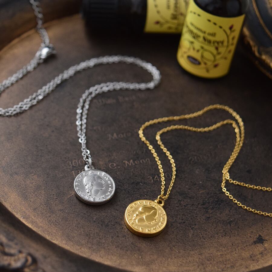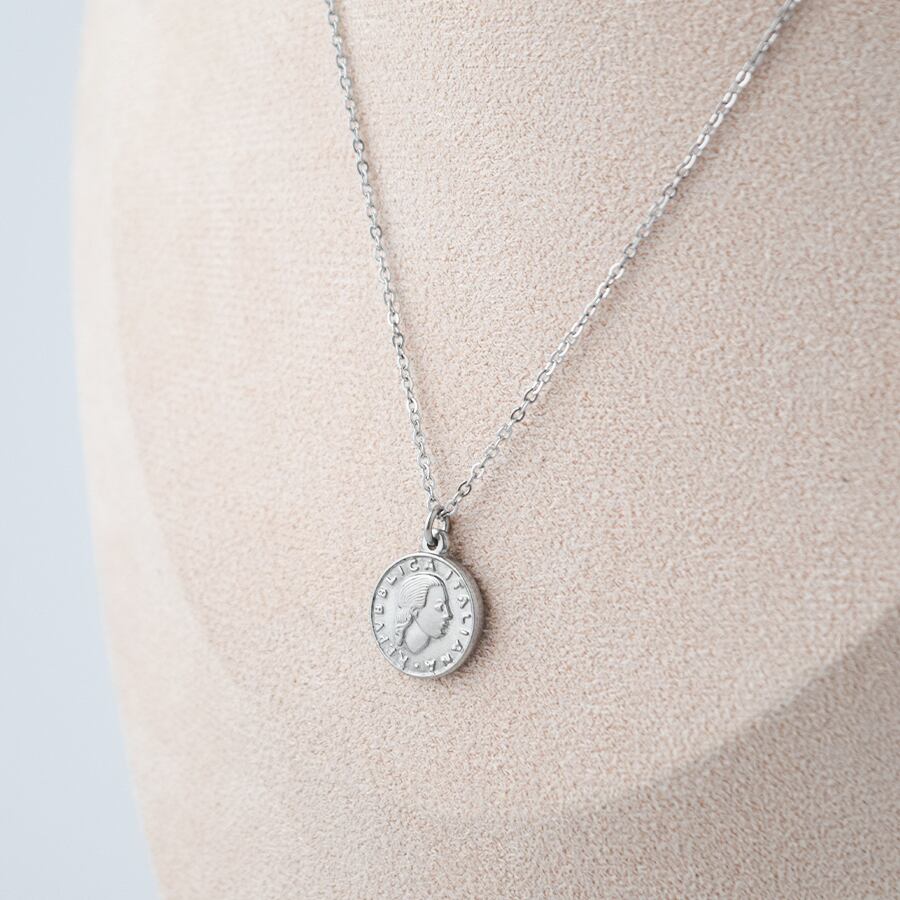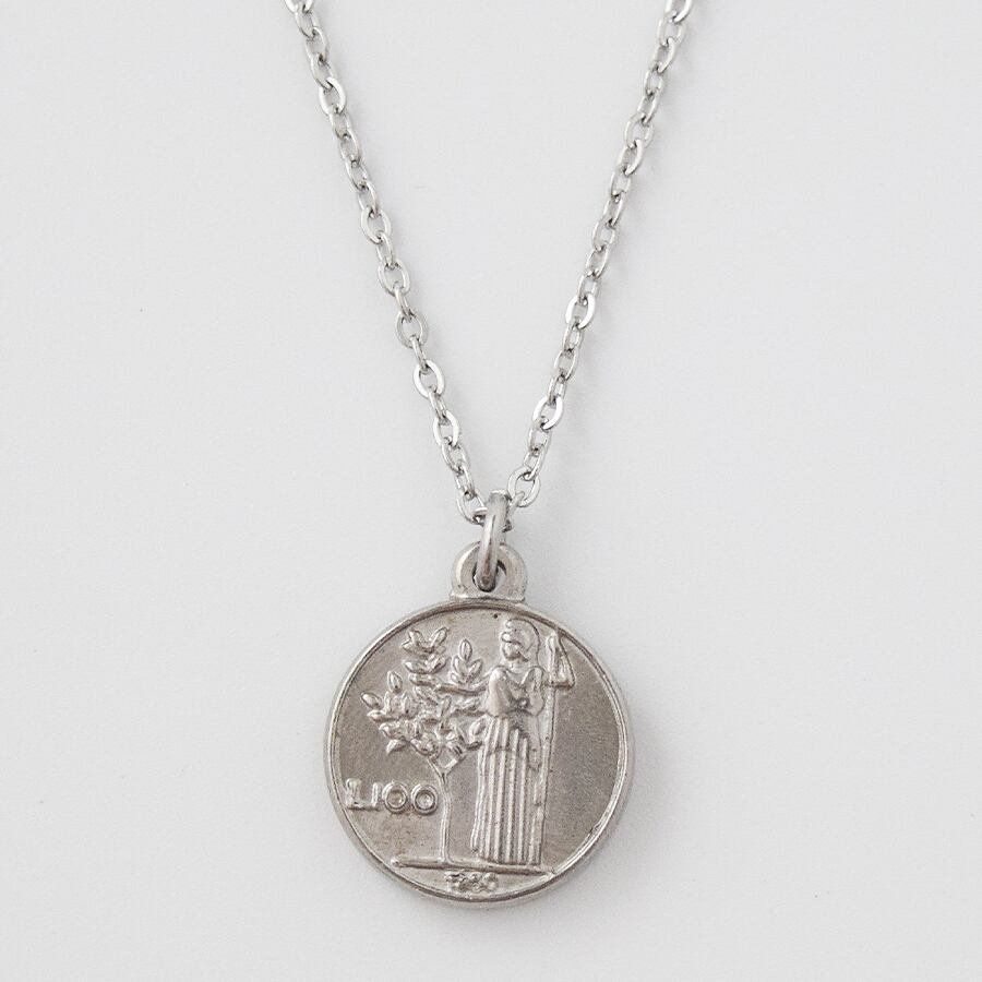 イタリアの100リラコインをモチーフにしたステンレス製のネックレス。