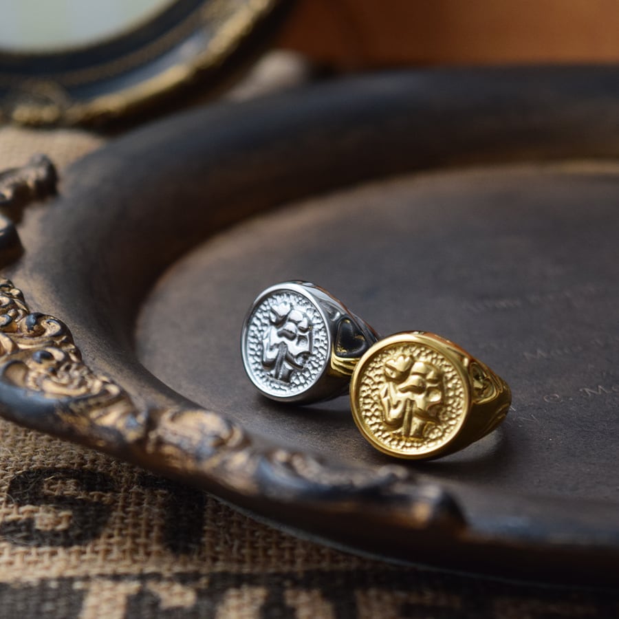 中央のフェイスには、古代コインを彷彿とさせる抽象的なモチーフ。背景に施された繊細な叩き加工(テクスチャー)が、光を乱反射させ、手元に奥行きのある輝きをもたらします。サイドのディテールには流れるようなラインの中にさりげなく刻まれたハートの彫り込みが、重厚なフォルムに温かみのある遊び心を添えています。