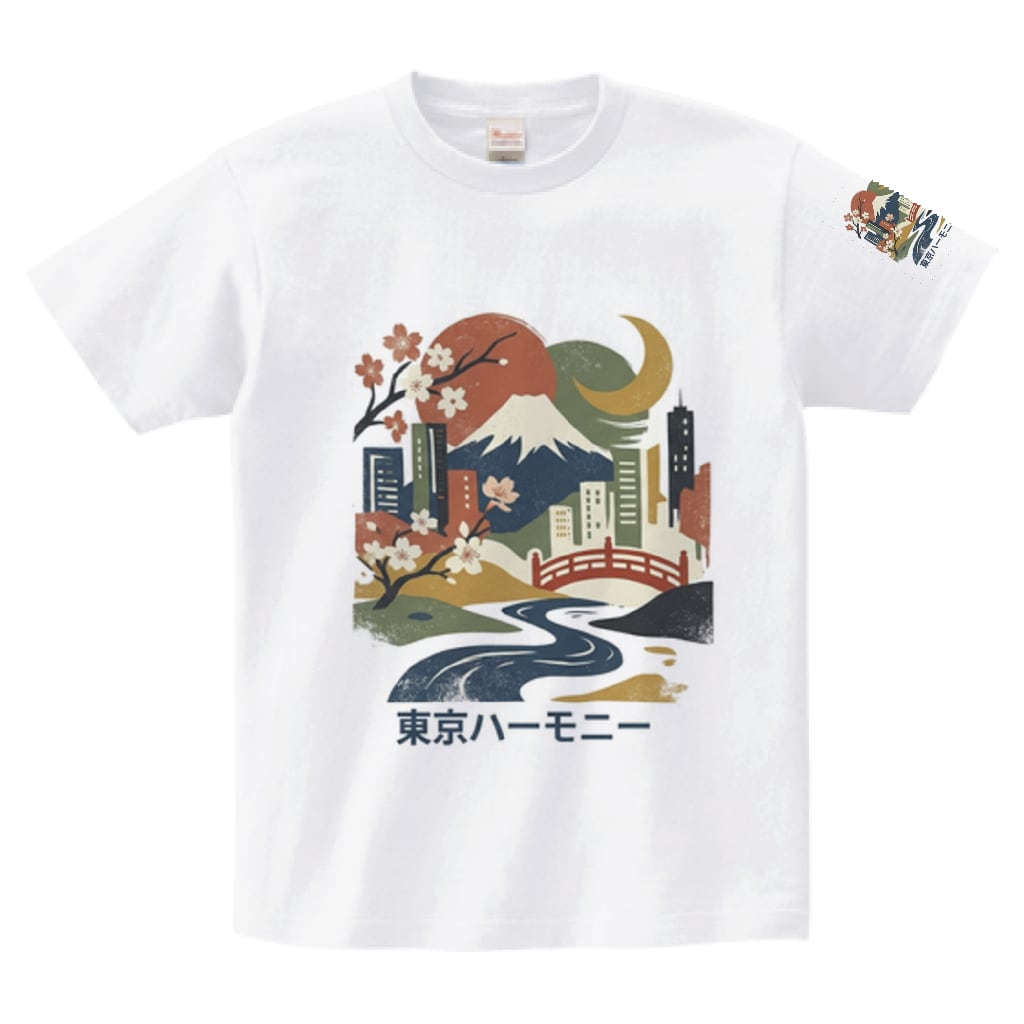 「伝統と現代が交差する、東京の鼓動を身に纏う。」 日本を象徴する富士山と、進化し続ける都市・東京のスカイラインを、現代的なフラットデザインと浮世絵の色彩感覚で融合させたオリジナルグラフィックTシャツです。 デザインのこだわり 和と洋のハーモニー: 伝統的な「赤富士」や「桜」のモチーフを、どこか北欧デザインやミッドセンチュリーを彷彿とさせる、くすみカラーのパレットで表現。 ヴィンテージ・テクスチャ: イラストレーターによるクリーンなラインに、あえて掠れや粒状感のある質感を加えることで、こなれたヴィンテージ感を演出。デニムやスラックスとの相性も抜群です。 タイポグラフィ: 「TOKYO HARMONY」の英字と、どこかノスタルジックな日本語フォントを配置。20代から40代まで、幅広い層が「今」の空気感で着こなせるストリート・モダンな仕上がりです。 20代: オーバーサイズを選んで、バギーパンツやテック系パンツと合わせたストリートスタイルに。 30代、40代: ジャケットのインナーとして差し色にしたり、タックインして綺麗めなチノパンと合わせる、大人の遊び心あるカジュアルスタイルにおすすめです。 商品詳細 カラー: ホワイト 素材: 綿100% サイズ 身丈 身幅 肩幅 袖丈 S 66 49 44 19 M 70 52 47 20 L 74 55 50 22 ※単位cm