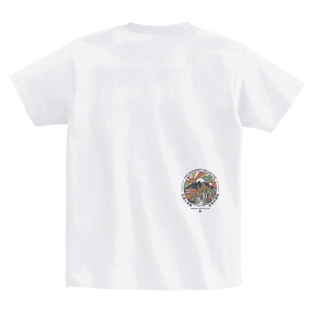 日本を象徴する富士山、桜、そして現代の都市景観。それらを「円(縁)」の中に美しく収めた、ステンドグラスのように緻密で芸術的なグラフィック。20代から40代の感性に響く、上品かつ力強いオリジナルデザインの一着です。