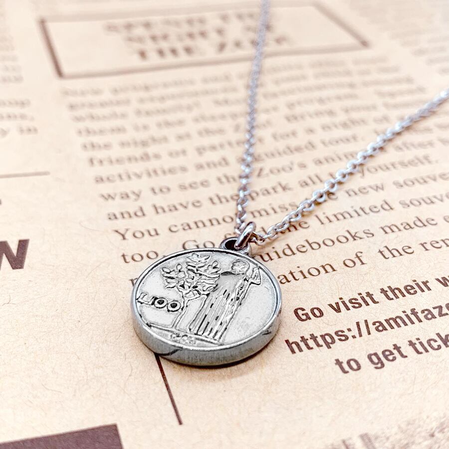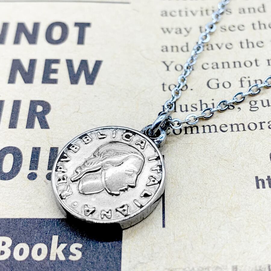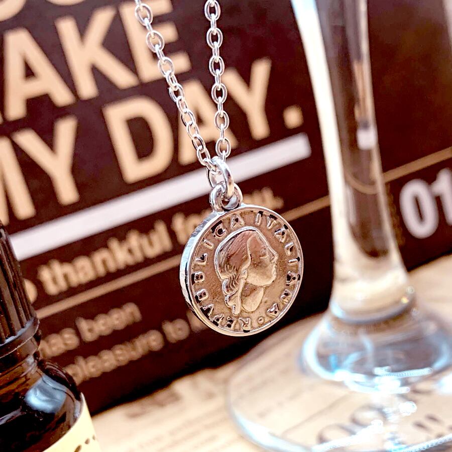 イタリアの100リラコインをモチーフにしたステンレス製のネックレス。