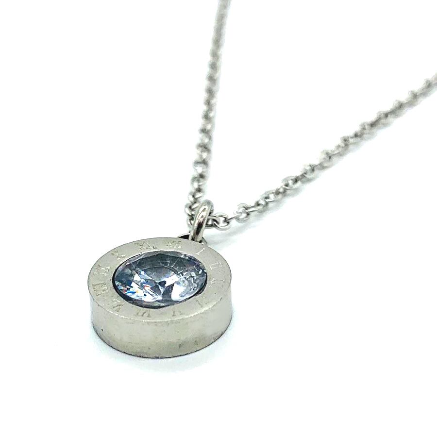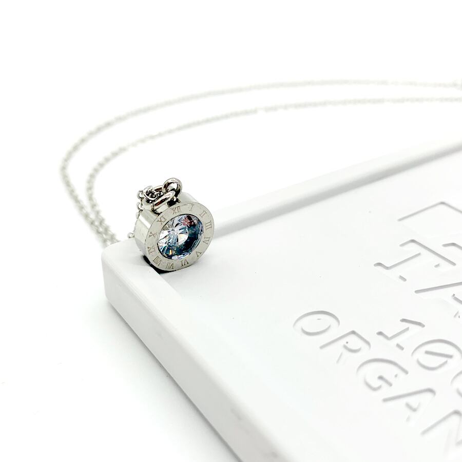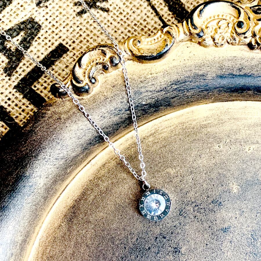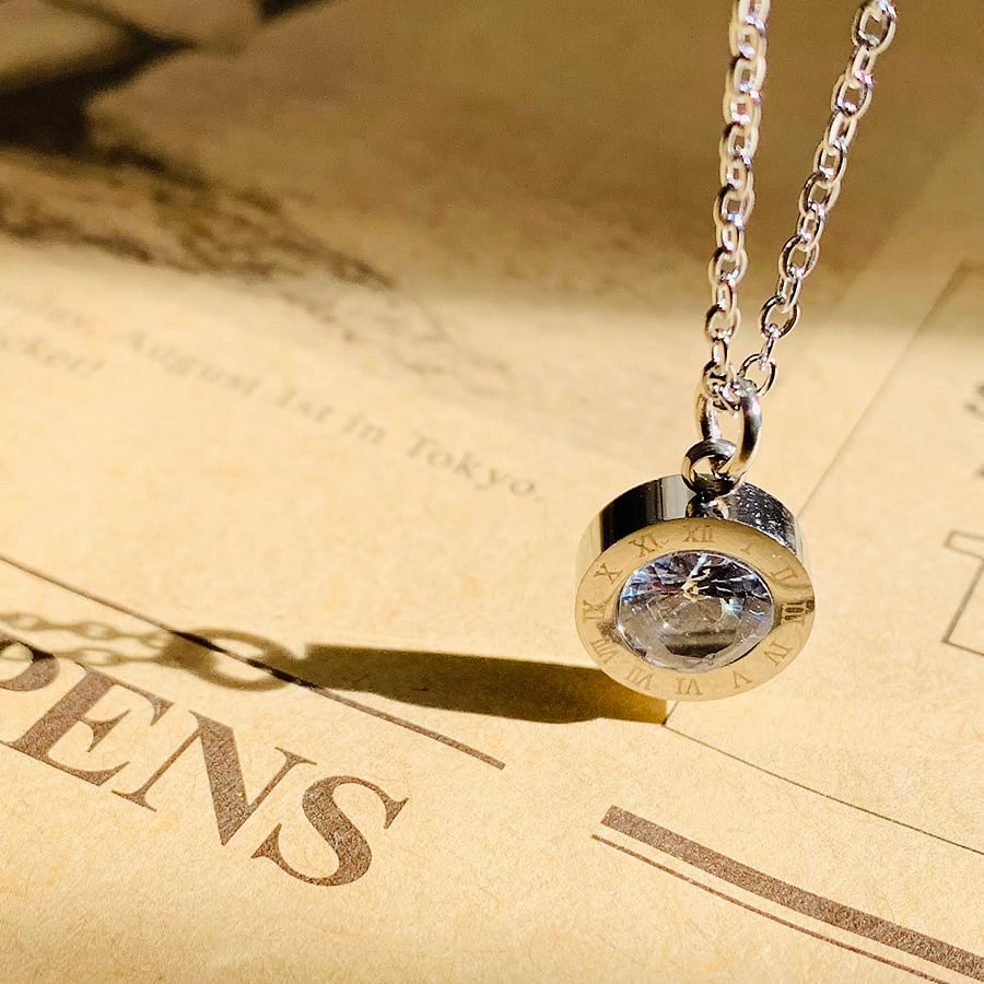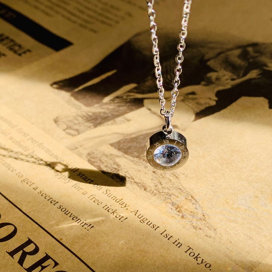 時の流れをローマ数字で表現し、中央にはラグジュアリー感漂うクリスタルがセットされたステンレス製のネックレス。
