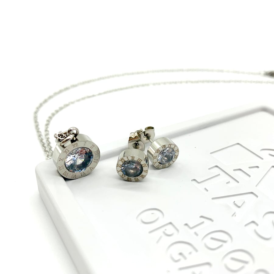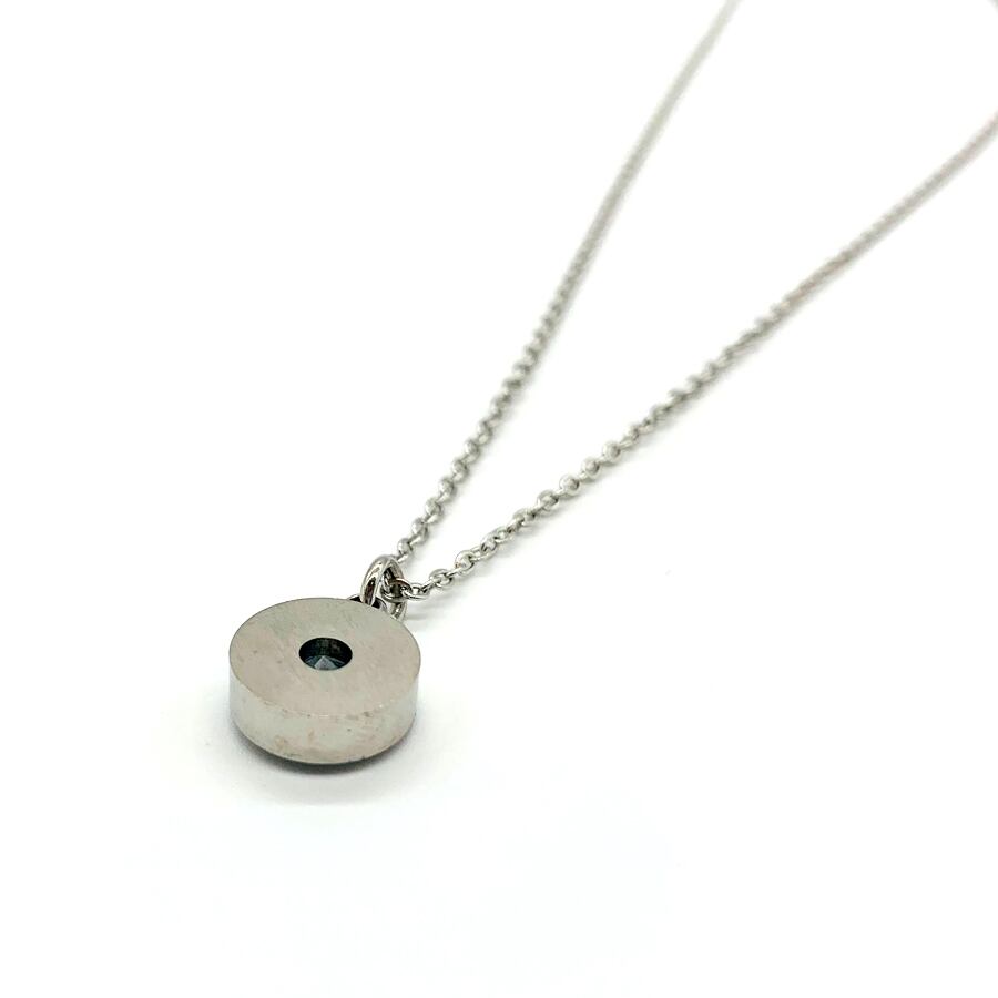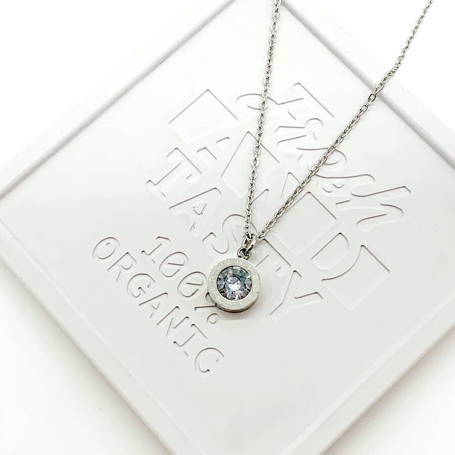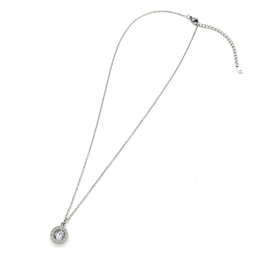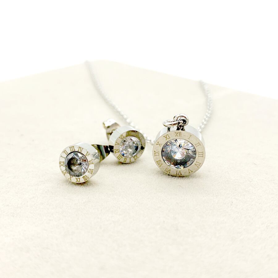 時の流れをローマ数字で表現し、中央にはラグジュアリー感漂うクリスタルがセットされたステンレス製のネックレス。