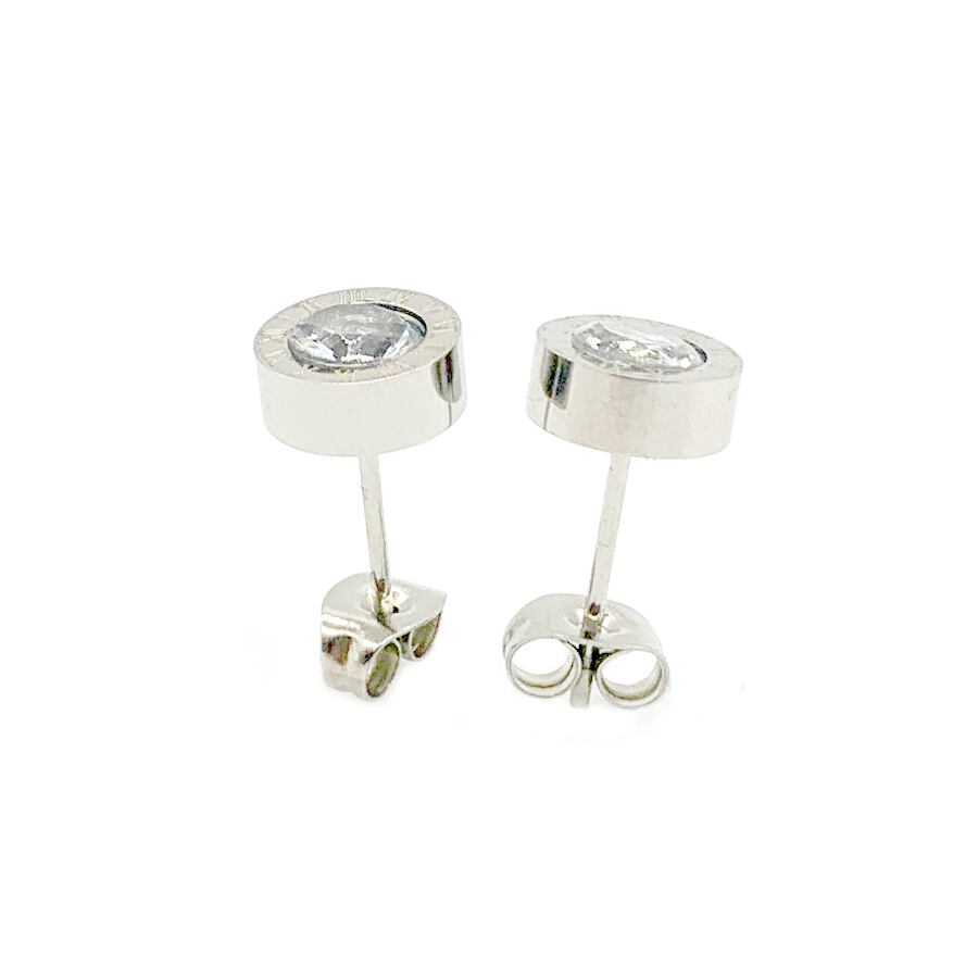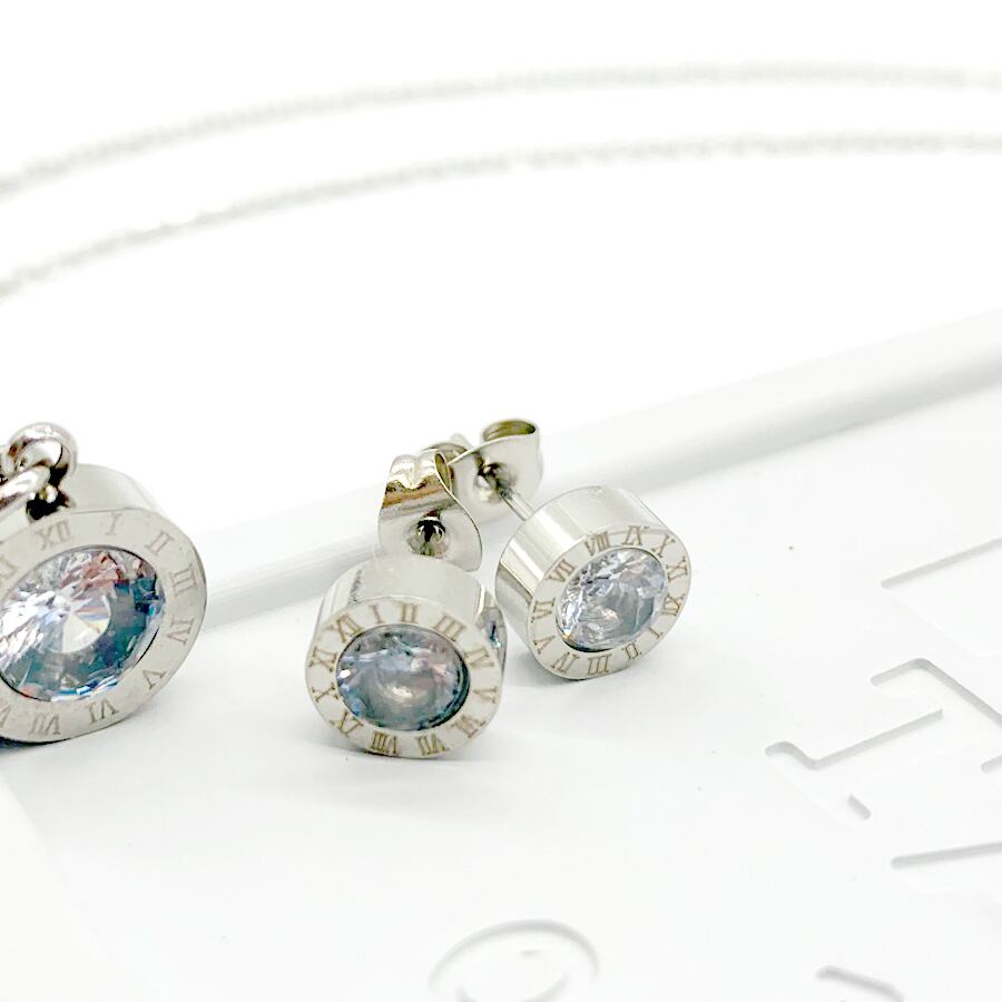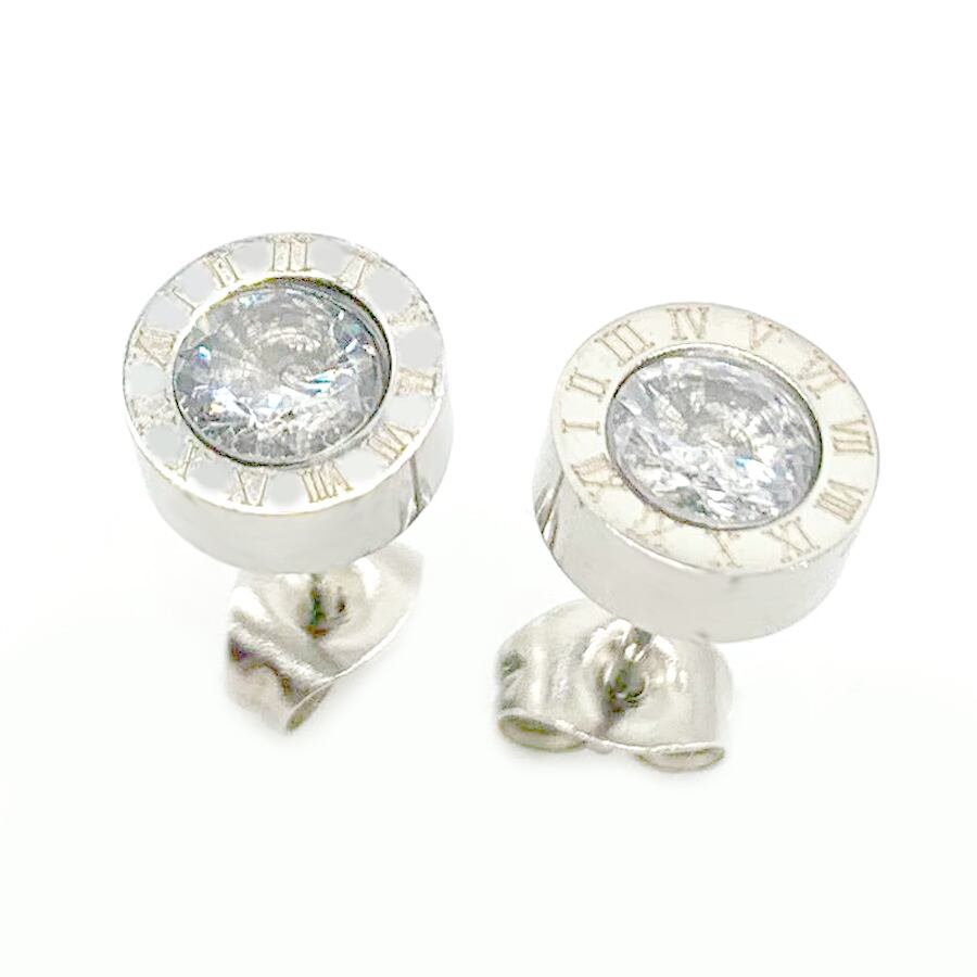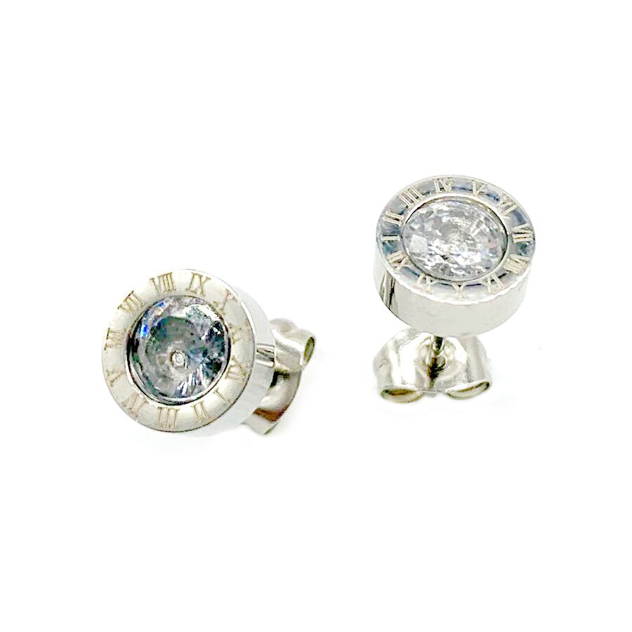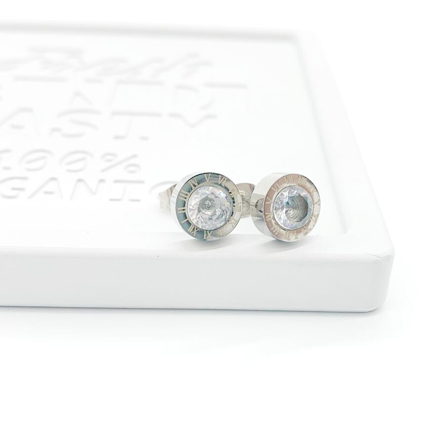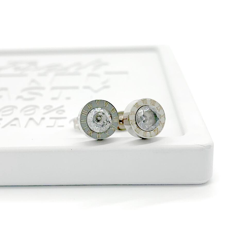 時の流れをローマ数字で表現し、中央にはラグジュアリー感漂うクリスタルがセットされたステンレス製のピアス。