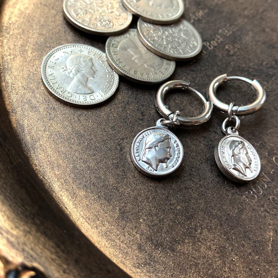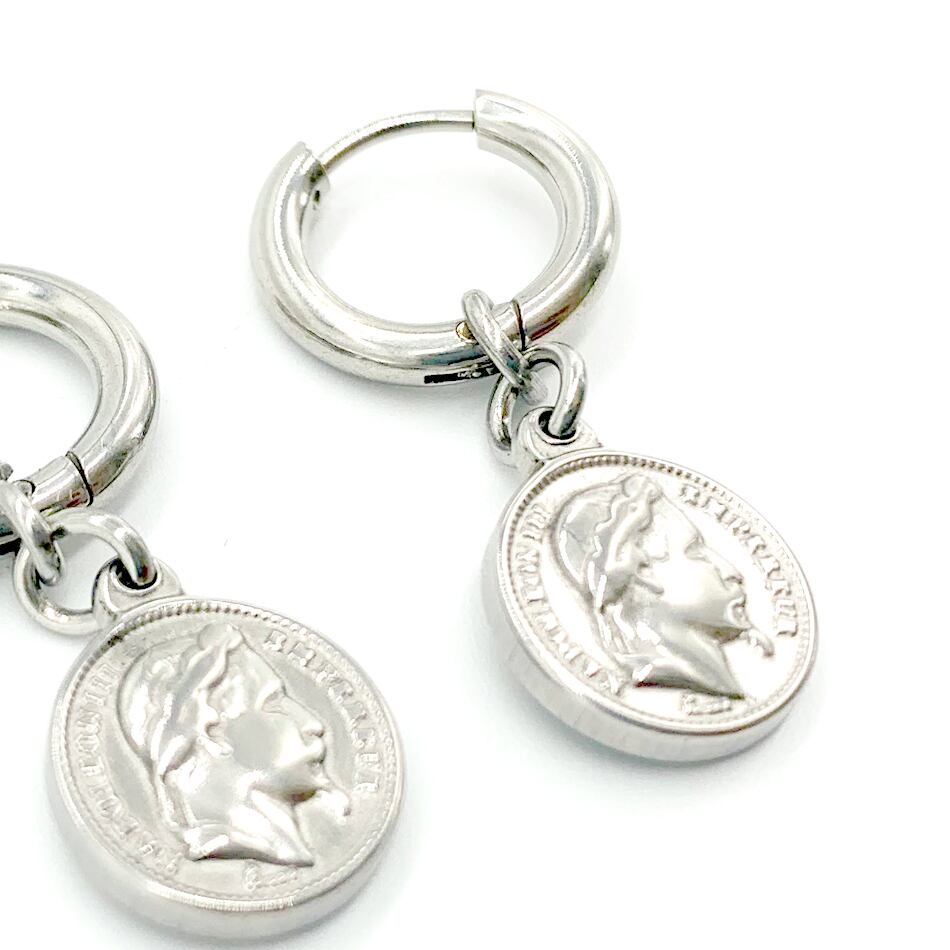 コイン部分が表と裏でデザインが違うリバーシブル仕様の珍しいデザインのフープ型ピアス。