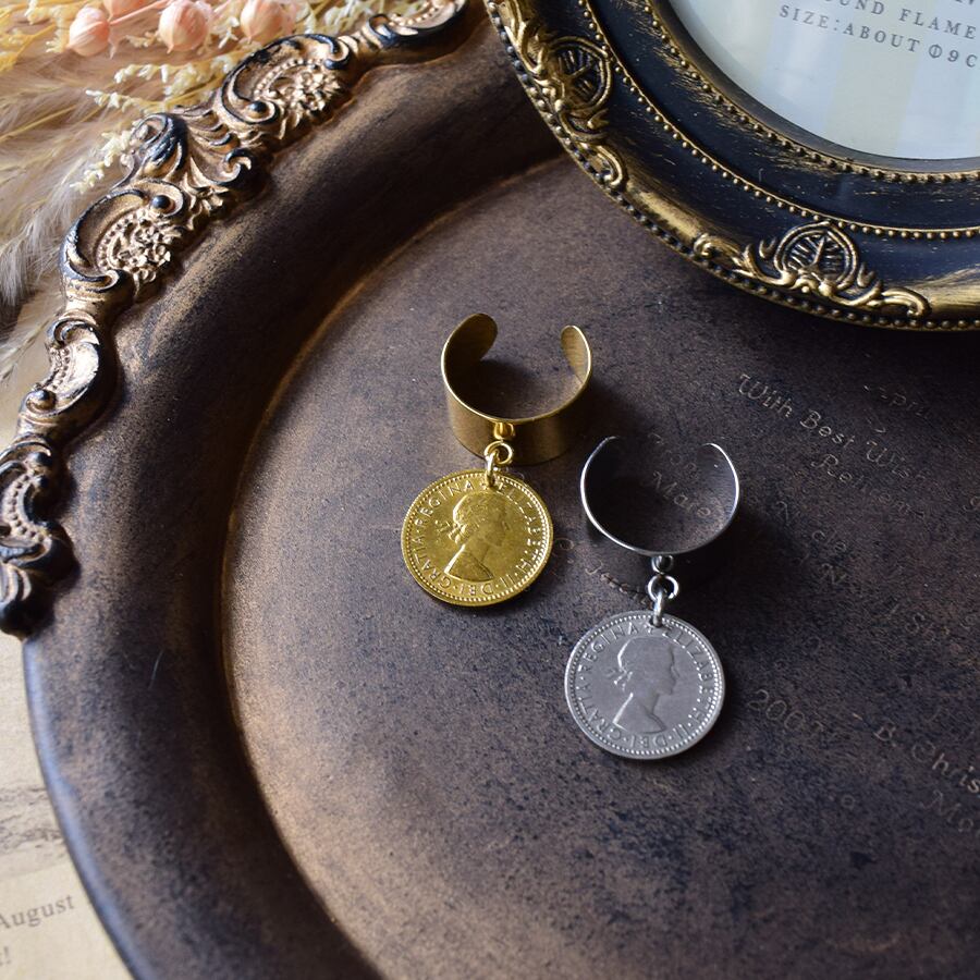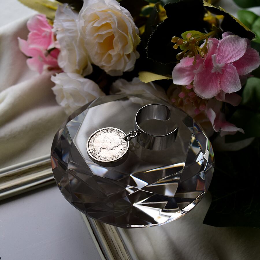 幸せを運ぶシックスペンスコインをワイドタイプのフリーサイズリングにセットしました。