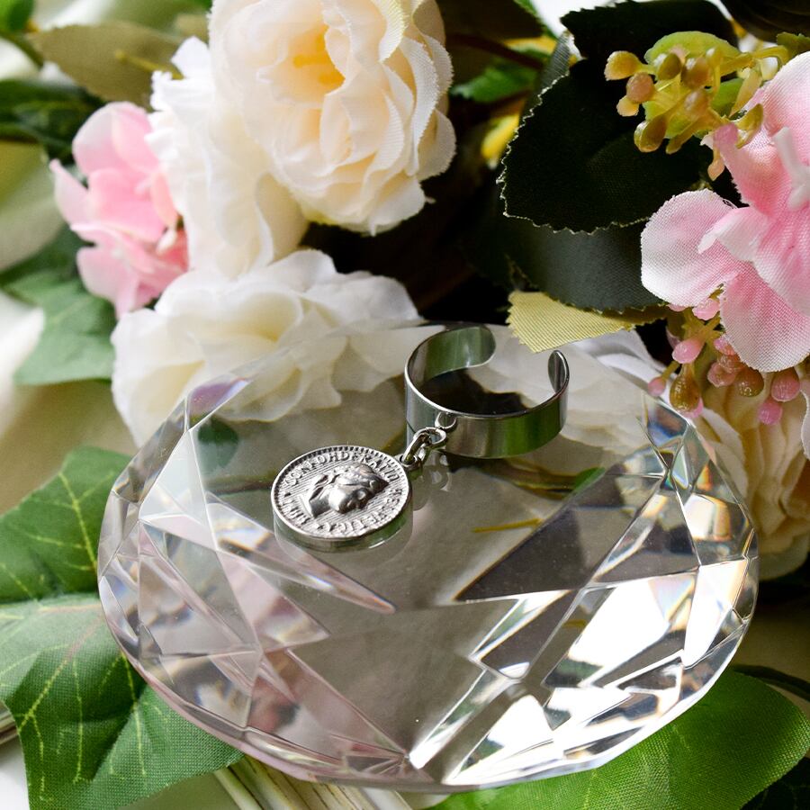スイスフラン(CHF)の硬貨の中で最小単位である「5ラッペン」をモチーフにしたステンレス製のフリーサイズのコインリング。