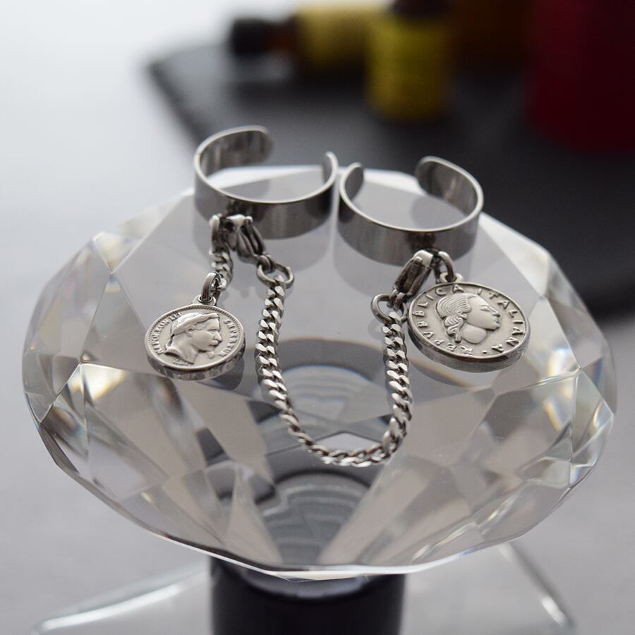 連結されたリングにゆらゆらと揺らめくコインが際立つチェーンリング。