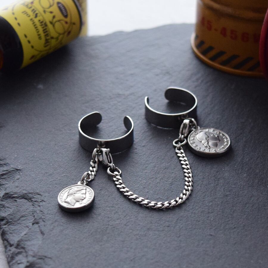 薬指のコインはリバーシブル仕様だから裏も表も両方楽しめるデザイン。 リング部分はフリーサイズ仕様だから指のサイズも気にせずリングサイズの微調整が可能です。変色にも強く、金属アレルギーに強いステンレス素材だから安心です。