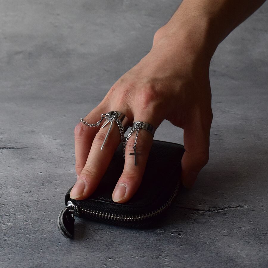 連結されたリングにクロスが際立つチェーンリング。小指着用のリングは切り離しができて、中指着用リングと人差し指着用リングの2連結リングだけでも使用可能。