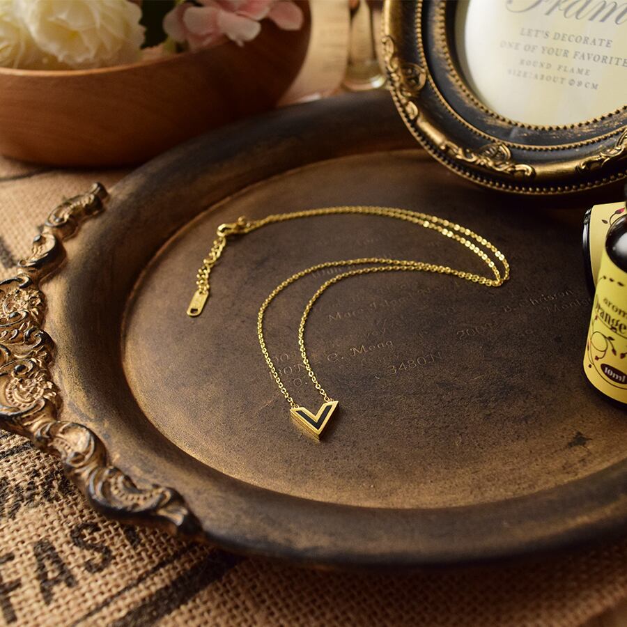 流行りのV字型ネックレスをよりモダンに、よりエレガントにブラックラインとのコンビネーションで大人の雰囲気たっぷりに。